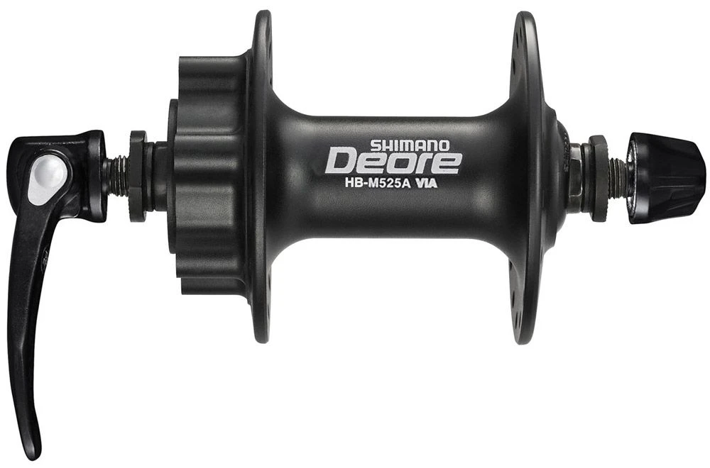 El buje delantero DEORE HB-M525A de Shimano con soporte de freno de disco de 6 orificios ofrece la conocida fiabilidad y rendimiento.
