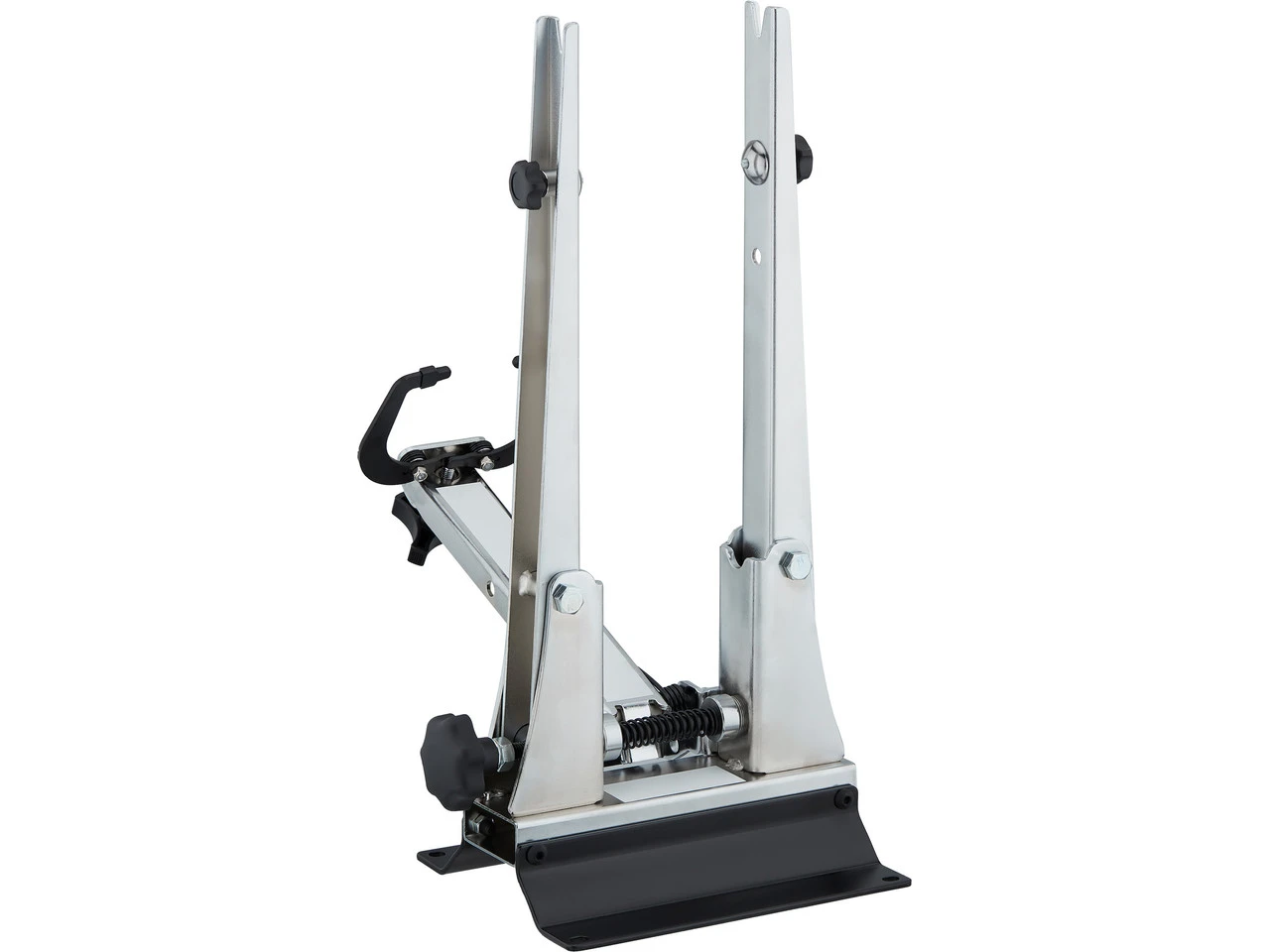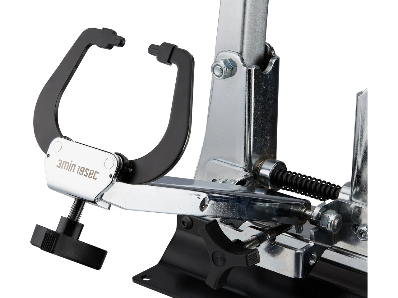 El soporte de alineación de 3min19sec se destaca por su amplia compatibilidad, estabilidad y facilidad de uso. Se puede ajustar de forma continua hasta un ancho de montaje de 180 mm y es compatible con todos los tamaños de llantas habituales. Se incluye un adaptador de ejes pasantes de 12 mm, 15 mm y 20 mm. El soporte de acabado macizo puede atornillarse al banco de trabajo para obtener un apoyo seguro o colocarse sobre su base. Ya que los brazos y el sensor de medición se ajustan siempre de forma sincronizada, la rueda se posiciona automáticamente en el centro. Los sensores están cargados con resortes de tal manera que no se produzca un bloqueo de ruedas.