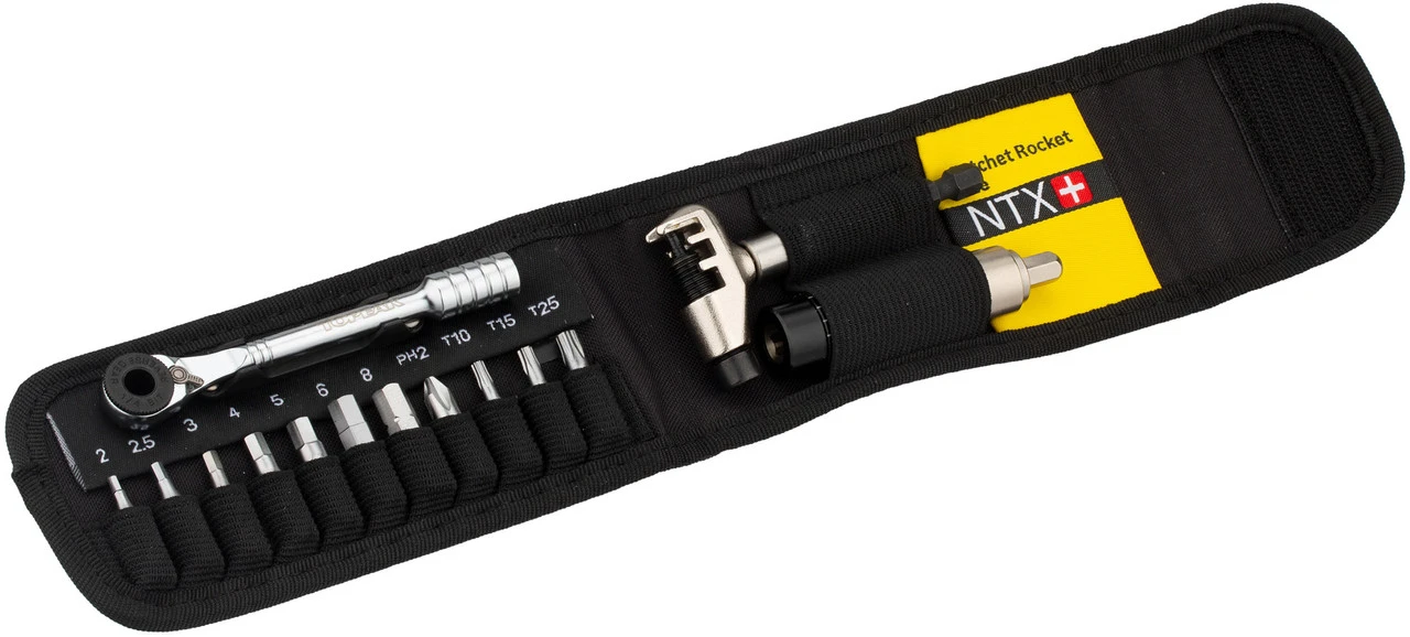 Con el mini juego de herramientas Ratchet Rocket Lite NTX+ de Topeak, tienes todo lo que necesitas para las reparaciones más frecuentes de bicicletas. La práctica bolsa de nailon contiene una carraca mini, una tronchacadenas, un accesorio de par de de giro de 2 a 6 Nm, un portapuntas magnético, así como puntas hexagonales, Torx y de estrella. Para facilitar la organización, los compartimientos de la bolsa están etiquetados con el tamaño de la punta correspondiente. En caso necesario, puedes guardar los parches en el compartimento por separado.